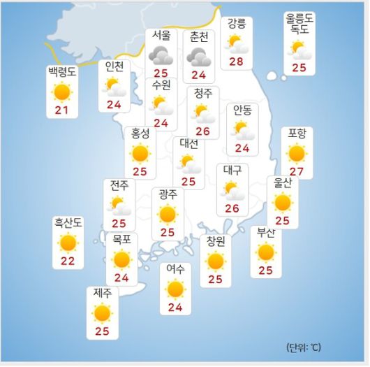 최고기온은 △서울 32도 △인천 30도 △춘천 31도 △강릉 35도 △대전 34도 △대구 36도 △전주 34도 △광주 33도 △부산 33도 △제주 32도 △울릉도 독도 31도 등이다.
