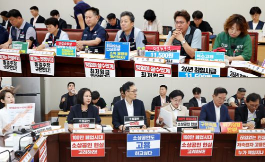 1일 세종시 정부세종청사 고용노동부에서 열린 최저임금위원회 제8차 전원회의에 참석한 노사 양측 위원들이 손팻말을 들고 팽팽하게 회의를 이어가고 있다. 뉴스1 |