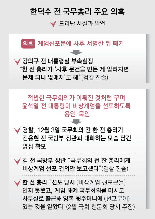 특검팀은 한 전 총리가 비상계엄 해제 이튿날인 지난해 12월 5일 강 전 실장으로부터 전달받은 계엄 선포문에 사후 서명했다는 의혹도 들여다보고 있다. 윤 전 대통령 측이 계엄 선포문에 국무총리 서명이 되지 않았다는 사실을 확인하고 사후에 서명을 받아 계엄의 불법성을 은폐하려 했다는 의혹이다. 한 전 총리는 이 문건에 서명을 했지만 뒤이어 “총리가 계엄을 추진하는 것처럼 비칠 수 있으니 폐기해 달라”고 요청한 것으로 알려졌다. 한 전 총리는 2월 국회 청문회에선 선포문인 것을 알지 못했고 회의를 마친 뒤 자신의 양복 뒷주머니에 있는 것을 뒤늦게 알았다고 해명하기도 했다.