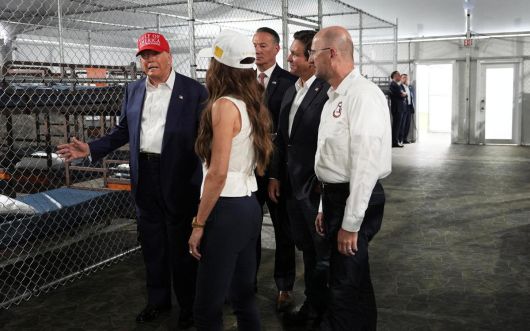 ‘악어 감옥’ 찾아간 트럼프 “불법이민자 탈출구는 추방뿐” 도널드 트럼프 미국 대통령(왼쪽)이 1일 ‘악어 감옥’으로 불리는 플로리다주 에버글레이즈의 불법이민자 구금 시설을 크리스티 놈 국토안보장관(왼쪽에서 두 번째), 론 디샌티스 플로리다 주지사(오른쪽에서 두 번째) 등과 둘러보고 있다. 시설이 악어, 비단뱀 등이 서식하는 늪지대에 자리해 이런 별명이 붙었다. 트럼프 대통령은 “이곳을 빠져나가는 유일한 길은 ‘추방’뿐”이라며 불법 이민자 근절 의지를 강조했다. 에버글레이즈=AP 뉴시스 |