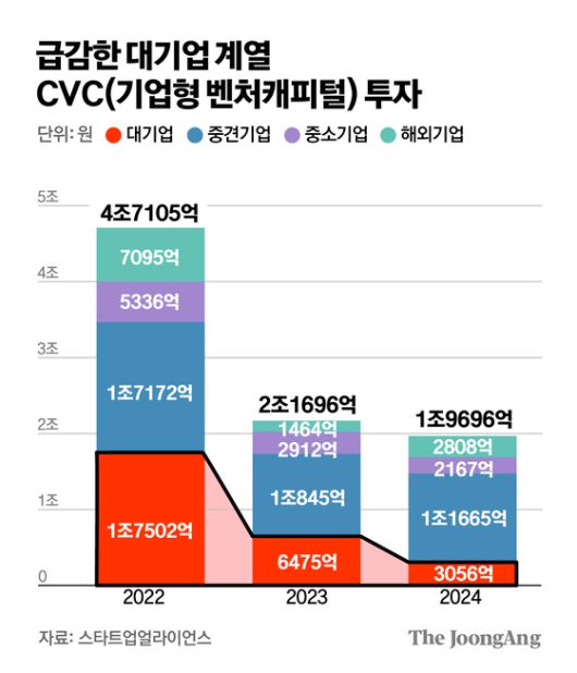 2일 민간 비영리 기관 스타트업얼라이언스에 따르면 지난해 국내 기업형 벤처캐피털(CVC) 투자액은 총 1조9696억원으로, 전년 대비 9.2% 줄었다. 특히 대기업 CVC 투자액은 2023년 6475억원에서 지난해 3056억원으로 52.8% 급감했다. 투자 활황기였던 2022년(1조7502억원)과 비교하면 5분의 1 수준이다.