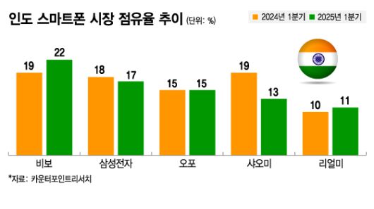 인도는 샤오미, 오포, 비보, 리얼미 등 중국 브랜드의 입지가 강한 시장이다. 샤오미가 수년간 1위를 고수했으나 2023년부터 비보가 급부상해 선두를 유지 중이다.