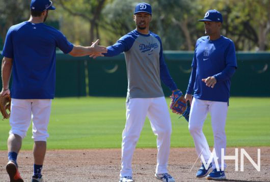 (디노 에벨 LA 다저스 3루 코치(왼쪽)가 연습 후 선수들을 격려하고 있다) |