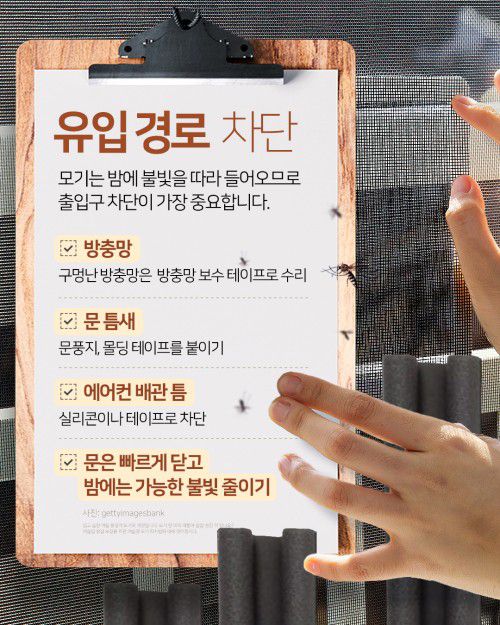 모기는 밤에 불빛을 따라 들어오므로 출입구 차단이 가장 중요합니다.