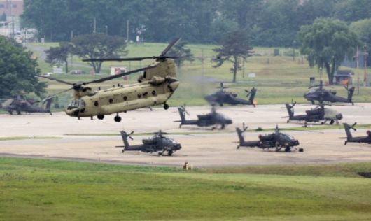 치누크(CH-47) 헬기가 2024년 5월 21일 세계 최대 규모의 미군 해외 주둔기지인 경기도 평택시 캠프 험프리스에서 이동하고 있다./연합 |