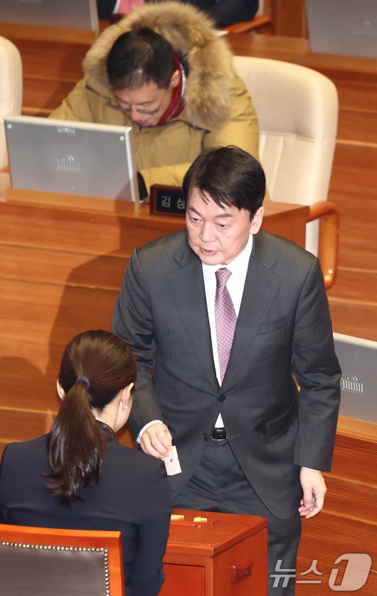 안철수 국민의힘 의원이 2024년 12월 14일 오후 서울 여의도 국회에서 열린 제419회국회(임시회) 제4차 본회의에서 윤석열 대통령 탄핵소추안 무기명 투표를 하고 있다. 안 의원 뒷편은 찬성 의사를 밝힌 김상욱 의원. 2024.12.14/뉴스1 ⓒ News1 김민지 기자 |