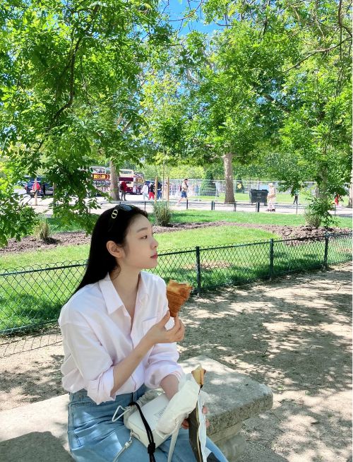 첫 장면은 파리 공원의 벤치. 연핑크 셔츠와 연청 데님, 머리 위로 내려앉은 선글라스, 그리고 손끝에 닿은 바삭한 크루아상까지. 모든 것이 우연 같지만 조화로웠다. 나무 그늘 아래서 찍힌 컷엔 바람, 향기, 시간까지 담겨 있었다.