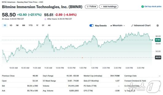 2일(현지시간) 뉴욕증시에서 비트마인은 27.17% 폭등한 58.50달러를 기록했다. 이로써 비트마인은 지난 5거래일 동안 무려 1238% 폭등했다.
