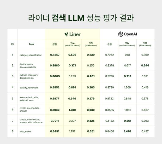 [이데일리 김현아 기자] 글로벌 AI 검색 스타트업 라이너(Liner, 대표 김진우)가 자체 개발한 ‘라이너 검색 LLM(Search Large Language Model)’의 성능이 오픈AI의 GPT-4.1을 뛰어넘었다고 3일 밝혔다. 특히, AI 검색에 최적화된 8가지 핵심 컴포넌트를 기준으로 정확도, 속도, 비용 면에서 모두 우수한 평가를 받아 검색 특화 LLM의 가능성을 입증했다.