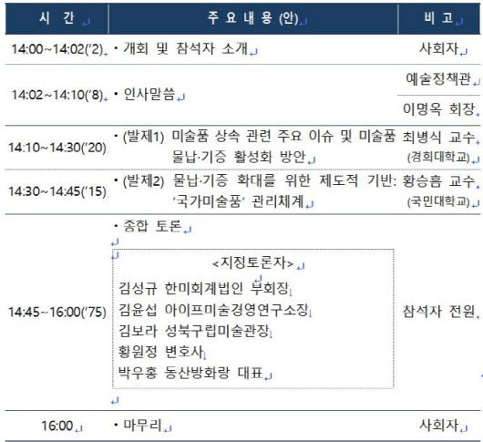 이후 김성규 한미회계법인 부회장과 김윤섭 아이프미술경영연구소장, 김보라 성북구립미술관장, 황원정 변호사, 박우홍 동산방화랑 대표는 참석자들과 함께 미술품 물납제 활성화 방안에 대해 토론한다.