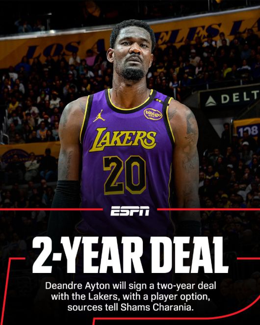 ESPN은 3일(한국시간) "FA 에이튼이 LA 레이커스와 2년 계약을 한다"고 전했다. 선수 옵션이 포함된 계약으로 에이튼은 다음 시즌 연봉 3400만 달러를 받을 예정이다. ESPN에 따르면 에이튼의 에이전트와 LA 레이커스 롭 펠린카 단장이 만나 계약을 체결했다.