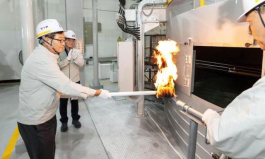KCC Group Chairman Chung Mong-jin grips a torch to celebrate the commencement of KCC's second glass wool production line in its Gimcheon factory, August 31, 2023. Courtesy of KCC |
