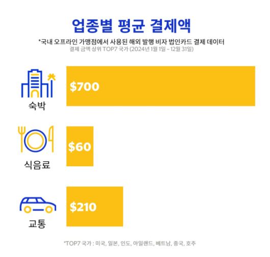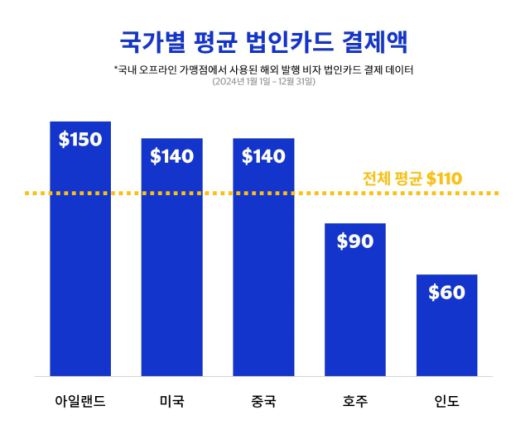 전체 해외 발행 법인카드 소지자가 결제한 1회 평균 금액은 약 110달러(약 14만 8280원[1])였다. 이 중 상위 7개국의 법인카드 소지자가 결제한 1회 평균 금액은 115달러(약 15만 5020원)로, 미국(140달러), 아일랜드(150달러), 중국(140달러) 발급 카드의 객단가는 평균보다 약 30% 이상 높았고, 인도(60달러)와 호주(90달러)는 평균 대비 낮은 결제액을 보였다.