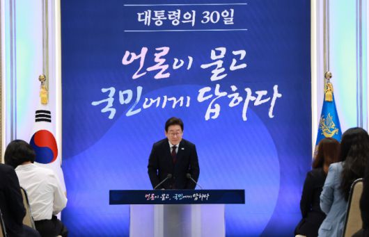 이재명 대통령이 3일 청와대 영빈관에서 열린 '대통령의 30일, 언론이 묻고 국민에게 답하다' 기자회견에서 인사하고 있다. 연합뉴스 |