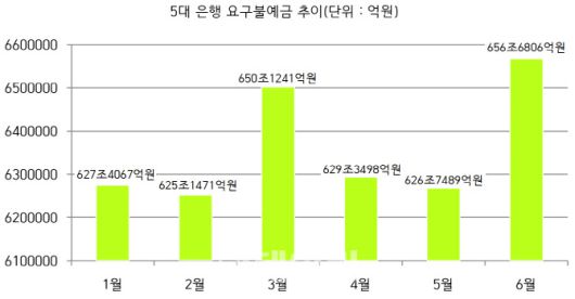 3일 5대 은행(KB국민·신한·우리·하나·NH농협)에 따르면 수시입출금식 저축성예금(MMDA)을 포함한 요구불예금은 6월 말 기준 656조 6806억원으로 집계됐다. 5월 말(626조 7489억원)과 비교해 한 달 만에 무려 29조 9317억원 급증했다. 반면 같은 기간 정기예금은 8조 9332억원 감소한 931조 9343억원을 기록했다.