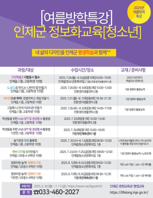 참가 신청은 7월 11일까지 인제군 평생학습 홈페이지 / 네이버 폼(https://naver.me/5pqxzKVS)를 통해 가능하며, 각 과정은 접수인원 초과 시 추첨을 통해 수강생을 선정한다. 수강료는 전액 무료로 일부 과정은 USB 저장장치 등 준비물이 필요하다.