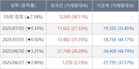 [서울=뉴스핌] 로보뉴스 = 03일 10시 15분 현재 큐로셀(372320)은 전일 대비 7.18% (현재가 32,100원) 상승했고, 외국인이 최근 5일 연속 순매수(누적 53,371주, 잠정) 행진을 하고 있다.