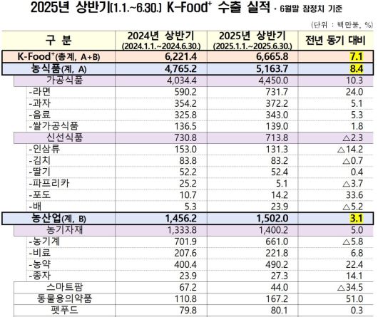 농림축산식품부는 2025년 상반기 K-Food+ 수출액(잠정)이 지난해보다 7.1% 증가한 66억7000만 달러를 달성했다고 3일 밝혔다. K-Food+는 농식품(신선, 가공)에 농산업(스마트팜, 농기자재, 동물약품 등)을 합친 것이다.
