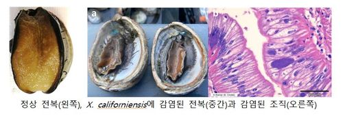 정상 전복과 제노할리오티스 캘리포니엔시스에 감염된 전복 |