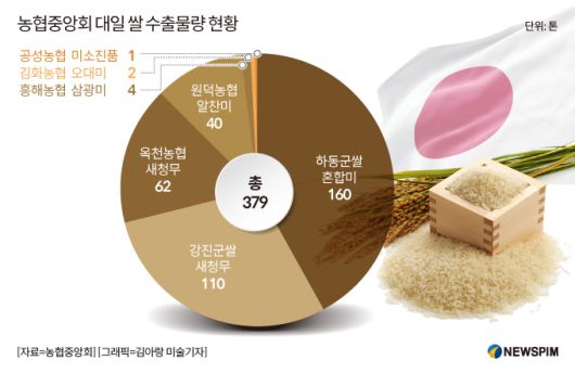 대일 쌀 수출의 증가세도 확연하다. 농협중앙회가 집계한 올해 국산 쌀의 대일본 수출 물량은 지난달 말 기준 379톤에 달한다. 하동군쌀 '혼합미'가 160톤으로 가장 많았고, 강진군쌀 '새청무'(110톤), 옥천농협 '새청무'(62톤), 원덕농협 '알찬미'(40톤), 홍해농협 '삼광미'(4톤), 김화농협 '오대미'(2톤), 공성농협 '미소진품'(1톤)이 뒤를 이었다.