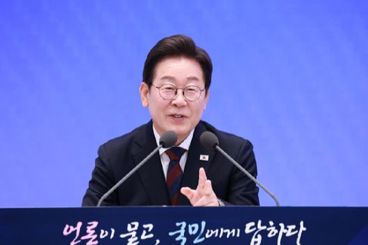 이재명 대통령이 3일 청와대 영빈관에서 열린 '대통령의 30일, 언론이 묻고 국민에게 답하다' 기자회견에서 기자들 질문에 답하고 있다. 2025.7.3 [사진=연합뉴스] |