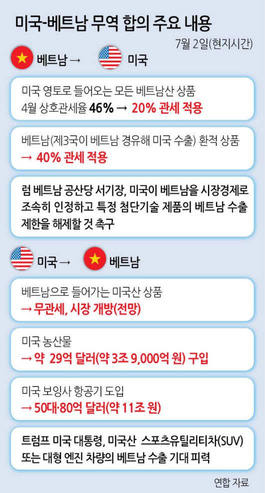 트럼프 대통령은 이날 자신의 사회관계망서비스(SNS)에서 “미국 영토로 들어오는 모든 베트남산 상품은 관세 20%, 베트남을 거쳐 미국으로 들어오는 환적 상품은 40%의 관세를 부과할 것”이라고 밝혔다.
