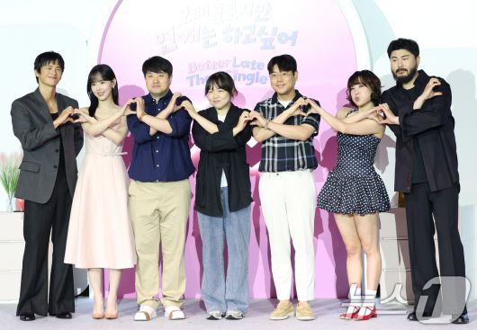 (서울=뉴스1) 권현진 기자 = 서인국(왼쪽부터)과 강한나, 조욱형 PD, 김노은 PD, 원승재 PD, 이은지, 카더가든이 3일 오전 서울 용산구 CGV용산아이파크몰에서 열린 넷플릭스 예능 '모태솔로지만 연애는 하고 싶어' 제작발표회에 참석해 포즈를 취하고 있다. '모태솔로지만 연애는 하고 싶어'는 우리도 제발 연애하고 싶다! 연애 초보, 모태솔로 성인 남녀들의 좌충우돌 설렘 가득한 첫 연애 이야기다. 2025.7.3/뉴스1