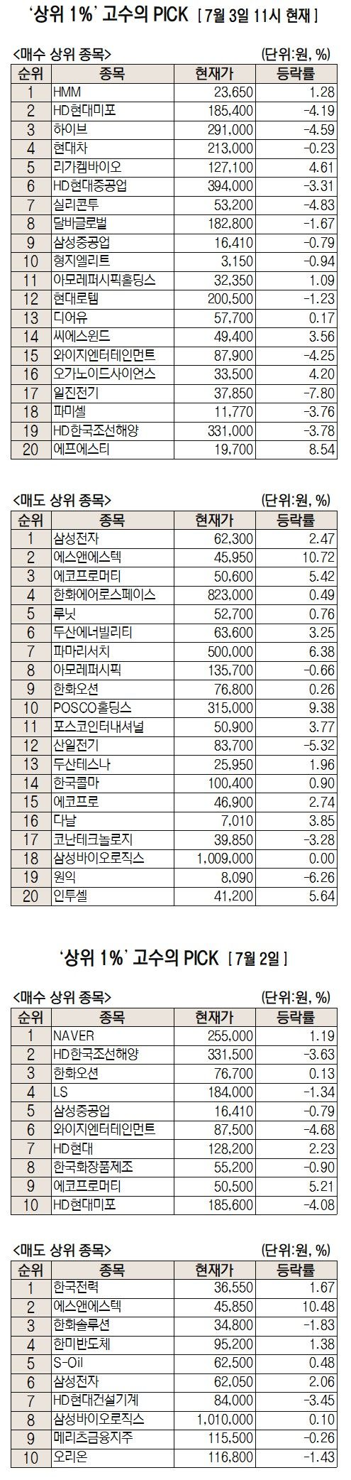 이날 미래에셋증권에 따르면 미래에셋증권 주식 거래 고객 중 최근 1개월간 투자수익률 상위 1%에 해당하는 ‘주식 초고수’들이 오전 11시까지 가장 많이 사들인 종목은 HMM이다.