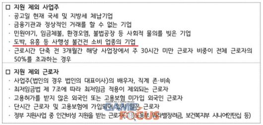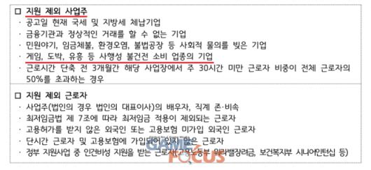 문제는 이 시범사업의 신청 자격이다. 신청 자격 중 지원 제외 사업주의 내용을 살펴보면 ▲ 체납 기업 ▲금융 기관과의 정상 거래 불가능 기업 ▲사회적 물의를 빚은 기업과 함께 ▲게임, 도박, 유흥 등 사행성 불건전 소비 업종의 기업을 명시하고 있다. 게임을 도박 유흥 업종과 함께 대표적인 사행성 불건전 소비 업종이라고 못 박고 있는 것.