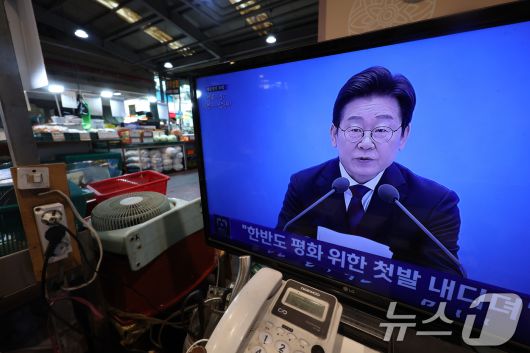 3일 오전 서울 서대문구 인왕시장에서 이재명 대통령의 취임 30일 기념 기자회견이 TV를 통해 나타나고 있다 . 2025.7.3/뉴스1 ⓒ News1 이동해 기자 |