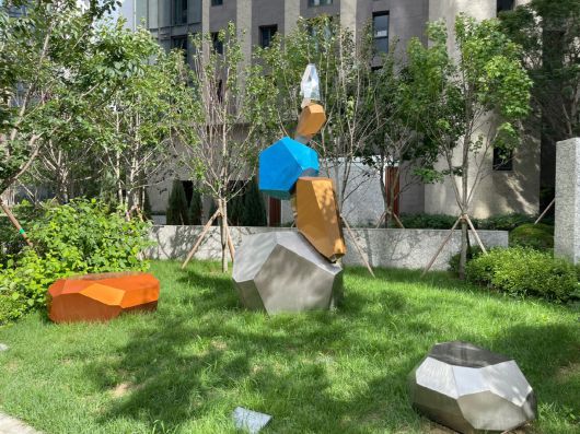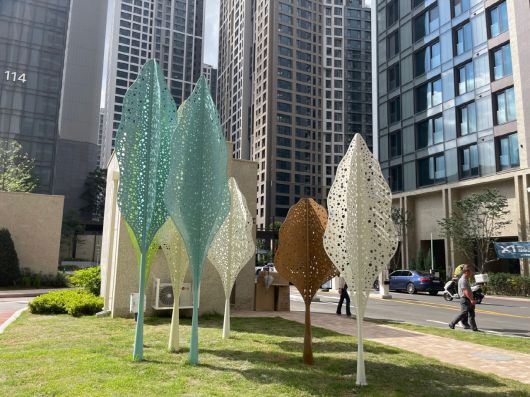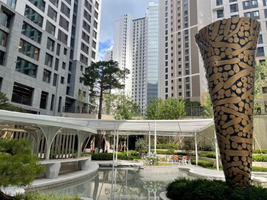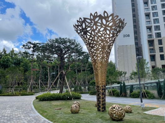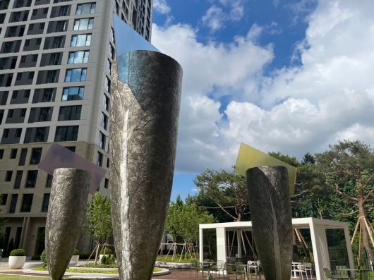 여러 작가의 작품들은 단지를 더욱 빛나게 한다. 이원경 작가의 '깃-숲'은 포근한 깃털의 이미지와 곧게 솟은 나무들과 울창한 숲의 이미지를 함께 읽어냈다. 각 유닛들이 만드는 리드미컬한 조형성이 돋보인다. 하늘을 향해 날아오르는 깃털이 바람에 의해 흔들리는 부드럽고 우아한 곡선을 시각화했다.