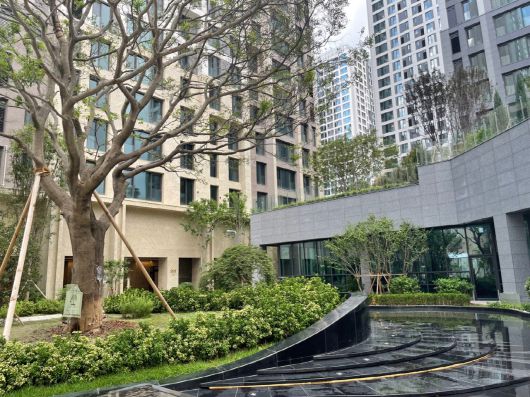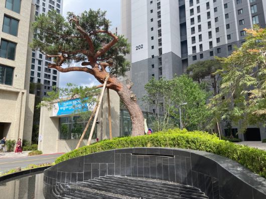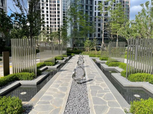 '워터폴 가든'은 커뮤니티 시설 상부의 놀이터 파고라와 지상부 수경의 경관을 통합적으로 설계한 정원이다. 위에서 떨어지는 물이 퍼져 나가는 모습을 화강석으로 겹겹이 올려 표현했다. 물결 너머 심겨진 커다란 팽나무가 묵묵히 그 풍랑을 이겨내는 모습이다.