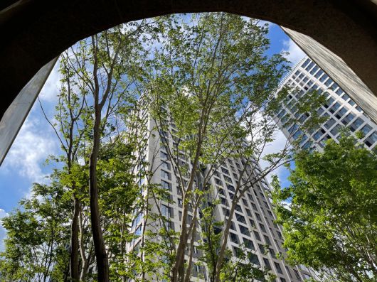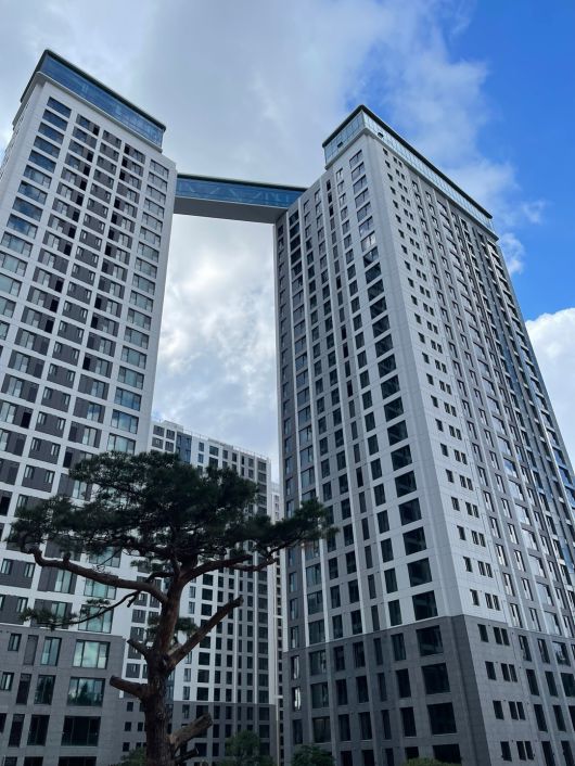 게이트 뒤로 펼쳐진 고층 건물들은 하늘을 향해 날렵하게 수직으로 뻗어 있다. 수직선 위주로 정리된 창호 라인과 균형 잡힌 마감재가 어우러지며 또렷한 스카이라인을 만들어낸다.