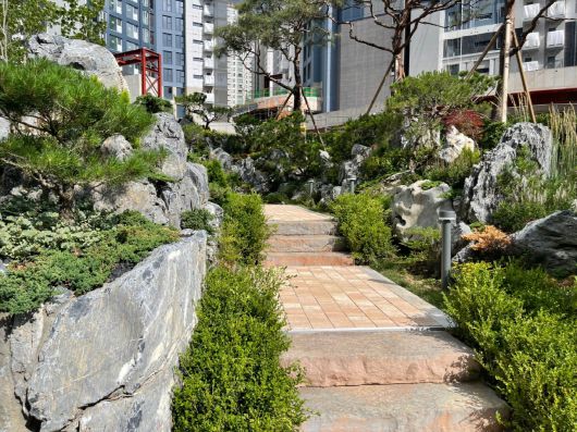 판다 조각상 옆에는 '스톤테라스'가 있다. 단지 경계부 단차가 크게 나는 공간을 돌이 있는 화단과 데크길로 조성해 휴게와 산책을 유도한 공간이다. 하나의 산수화를 연상시키는 아름다운 돌무리들과 그 사이 솟아오른 소나무와의 조화는 메이플자이만의 독특한 경관이다.