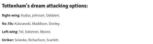이들은 손흥민이 주로 뛰던 왼쪽 윙어에 마티스 텔과 마노르 솔로몬, 마이키 무어 등 3명을 올렸다. 손흥민이 종종 뛰었던 원톱에는 도미닉 솔란키와 히샤를리송, 데인 스칼렛으로 구성했다. 오른쪽 윙어로는 브레넌 존슨과 윌손 오도베르가 버티는 그림에 모하메드 쿠두스를 더했다. 현재 토트넘은 웨스트햄 유나이티드와 쿠두스 영입을 두고 협상 중이다. 10번 공격형 미드필더에는 데얀 쿨루셉스키와 제임스 매디슨, 제이미 돈리를 세울 계획이다.