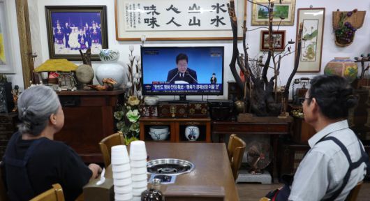 3일 오전 인천 남동구 구월동의 한 식당에서 주인들이 이재명 대통령의 '대통령의 30일, 언론이 묻고 국민에게 답하다' 기자회견을 시청하고 있다. /사진=뉴시스 |