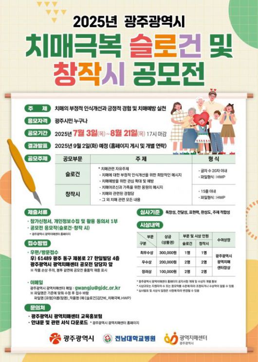 광주시가 '2025년 치매 극복 슬로건·창작시 공모전'을 개최한다. 이번 공모전은 치매에 대한 부정적 인식을 개선하고, 시민들의 적극적 참여를 통한 치매 친화적인 지역사회 분위기 확산을 위해 마련됐다.
