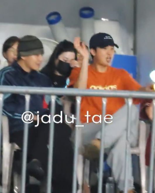 방탄소년단(BTS) RM이 뷔와 함께 진 팬 콘서트를 관람하던 중 러브버그를 손으로 쫓고 있다. /사진=X 갈무리 |