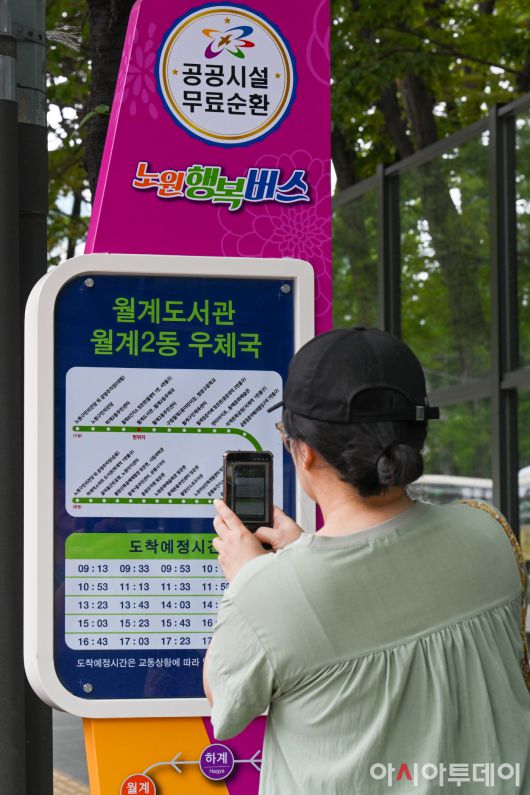 3일 서울 노원구 월계동 월계도서관 앞 노원행복버스 정류장에서 한 시민이 노선표를 휴대폰에 저장하고 있다. 노원구는 마을버스 및 시내버스 노선이 부족한 일부 지역 주민들의 교통 불편을 해소하고 체육시설, 동주민센터, 도서관, 문화예술시설 등 다양한 공공시설을 보다 쉽게 이용할 수 있도록 돕기 위해 노원행복버스 무료 순환 운행을 지난 1일부터 시작했다. /정재훈 기자
