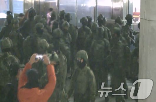 국회사무처가 계엄군의 국회 본관 진입 과정이 담긴 CCTV를 4일 공개했다. 김민기 국회사무총장은 국방부가 헬기로 24차례에 걸쳐 무장한 계엄군 230여 명을 국회 경내로 진입시켰다며 0시 40분에는 계엄군 50여 명을 추가로 국회 외곽 담장을 넘어 진입시켰다고 전했다. 사진은 국회 본관 진입을 시도하는 계엄군 모습. (국회사무처 제공) 2024.12.4/뉴스1 |