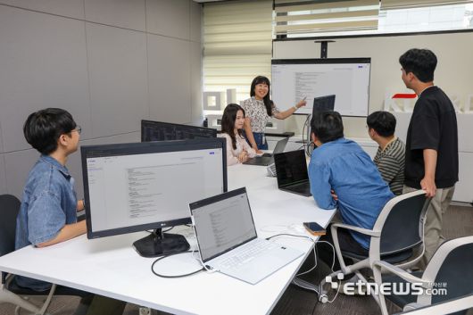KT가 '한국적 AI'의 철학을 담아 자체 개발한 언어모델 '믿:음 2.0'의 오픈소스를 AI 개발자 플랫폼 허깅페이스를 통해 공개할 예정이라고 3일 밝혔다. 사진은 KT 기술혁신부문 연구원들이 서초구 KT 우면연구센터에서 믿:음 2.0을 테스트하고 있는 모습. 김민수 기자 mskim@etnews.com [Copyright © 전자신문. 무단전재-재배포금지]