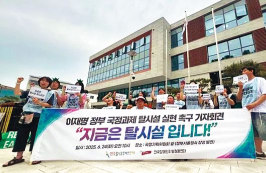 지난달 24일 전국탈시설장애인연대 등이 서울 종로구 국정기획위원회 앞에서 ‘이재명 정부 국정과제 탈시설 촉구 기자회견’을 열고 있다. 최현수 기자