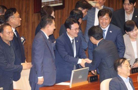 김민석 국무총리 후보자가 3일 국회에서 열린 본회의에서 임명동의안이 통과된 뒤 동료 의원들로부터 축하 받고 있다. 김현민 기자 |