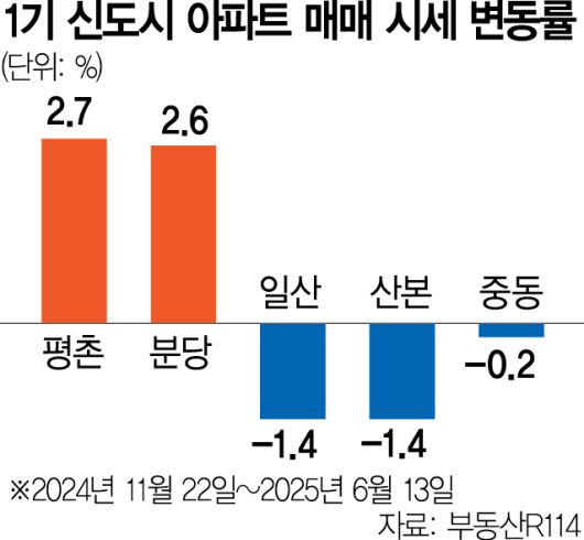 3일 부동산R114에 따르면 1기 신도시 선도지구 발표 직전인 지난해 11월 22일부터 지난달 13일까지 아파트 매매 가격 누적 변동률이 가장 높은 곳은 2.7%의 평촌이다. 분당이 2.6%의 상승률로 그 뒤를 이었고 일산·산본(-1.4%), 중동(-0.2%)은 하락했다.