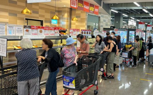아시아투데이 정문경 기자·최영 인턴 기자 = 3일 오전 10시 30분께 찾은 서울 강서구에 위치한 홈플러스 강서점. 델리 코너 앞을 가득 메운 줄이 늘어서 있다. 오전 11시부터 판매되는 홈플러스의 3000원대 치킨을 기다리는 손님들이다. 남편과 함께 마트를 찾은 60대 A씨는 "요즘에 이 정도 가격이면 거의 공짜나 다름없지"라고 농담을 건네며 웃음을 지었다.