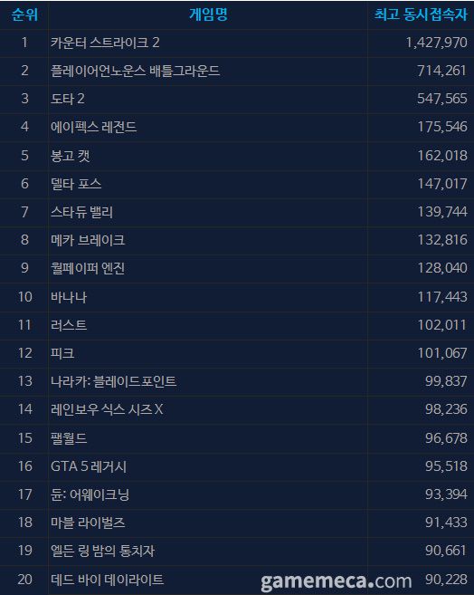 ▲ 7월 3일 오후 1시 기준 스팀 일 최고 동시접속자 TOP 20 (자료출처: 스팀) |