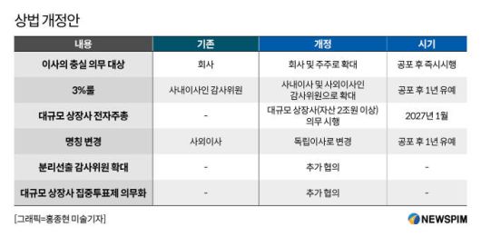다만 전자주주총회 도입은 준비 기간 등을 이유로 2027년 1월부터, '3% 룰 확대 적용'과 사외이사를 '독립이사'로의 명칭 변경 통일 조항은 1년간의 유예 기간을 두고 시행하기로 했다.