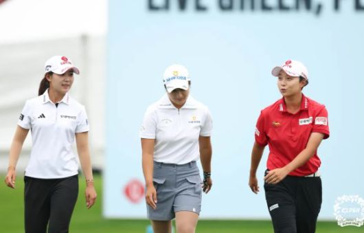 황유민(왼쪽), 김시현(가운데), 김효주가 3일 롯데 오픈 1라운드 10번홀에서 첫 티샷을 날린 뒤 이야기하며 페어웨이로 나가고 있다. [사진=KLPGA] |