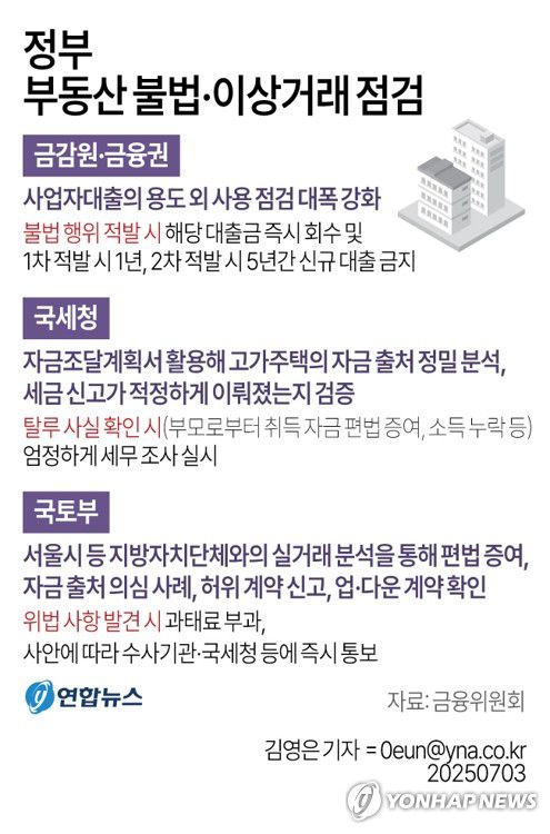 국토부는 서울시 등 지방자치단체와의 실거래 분석을 통해 편법 증여, 자금 출처 의심 사례, 허위 계약 신고, 업·다운 계약을 확인한다.