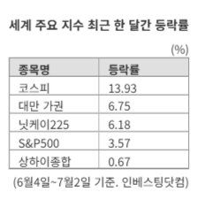 특히 코스피는 아시아 주요국 대비 압도적인 수익률을 보였다. 같은 기간 대만 가권지수 6.75%, 일본 닛케이225지수 6.18%에 비하면 한국증시는 두배이상 올랐다. 미국 스탠더드앤드푸어스(S&P)500지수 상승률은 3.57%, 중국 상하이종합지수는 0.67%상승했다.